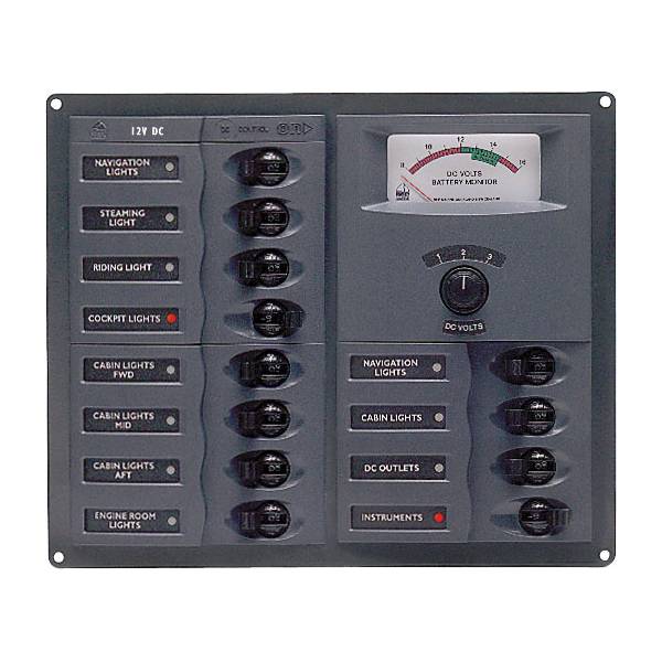 12V voltmeter panel med 12 brytere/sikringer....