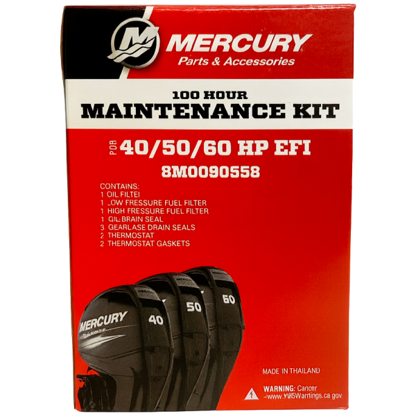 Mercury 100-timers Servicekit (varenr. 8M0094232) er et originalt OEM-sett for Mercury F150 EFI 4-takts utenbordsmotorer, produsert fra 2012 og nyere (serienummer 1B905505 og oppover).