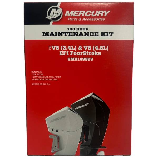 Mercury 100-timers Servicekit (varenr. 8M0120657) er et originalt OEM-vedlikeholdssett utviklet for Mercury Verado 4-takts rekkesekser (L6) motorer fra 200 til 300 HK, med serienummer 2B144123 og oppover.